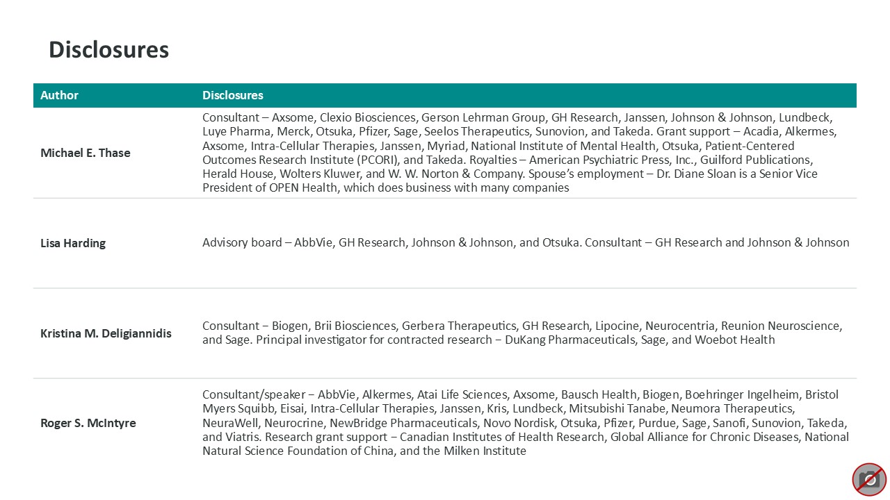 Author Disclosures Michael E. Thase Consultant – Axsome, Clexio Biosciences,